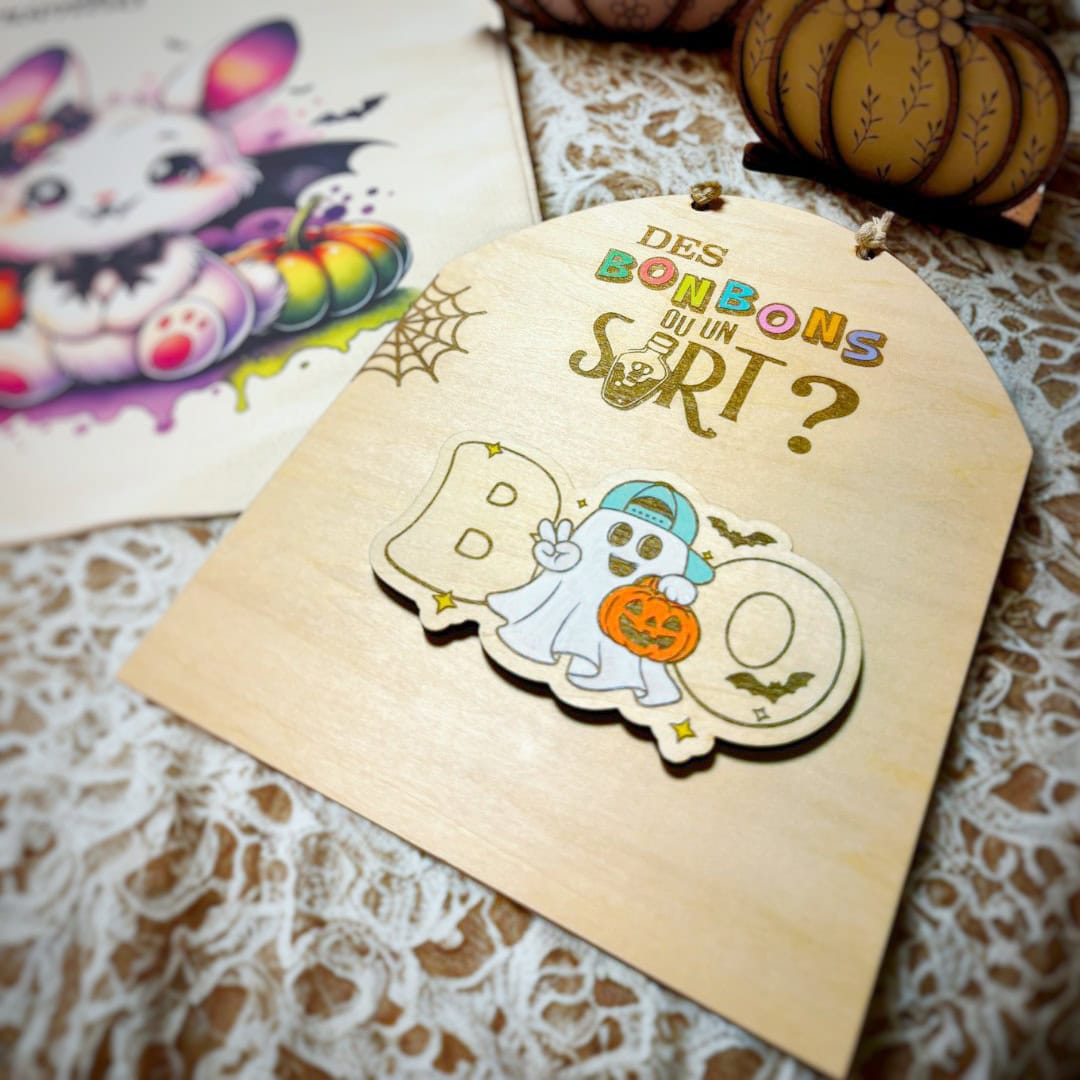 - Inscription : « Des bonbons ou un sort ? » gravée directement dans le bois.